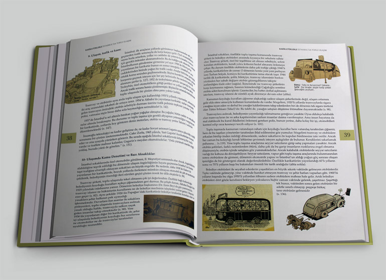 “Karikatürlerle İstanbul’da Toplu Ulaşım”, taşıma araçları ile şehir ve insan ilişkisini, gülmece unsurlarını ustalıkla kullanarak gündeme taşıyor. Osmanlı ve Cumhuriyet dönemin ulaşımı anlatan karikatörlerin yer aldığı kitap, iki İstanbul aşığı, Mario Levi ve Giovanni Scognamillo’nun kaleme aldığı yazılarla geçmişe doğru nostaljik bir yolculuk da yaptırıyor, okurlara.