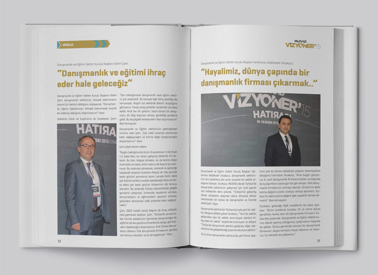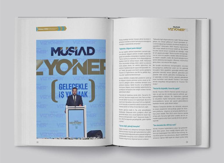 “MÜSİAD Vizyoner ’15, Gelecekle İş Yapmak” ismiyle yayınlanan bu eser, MÜSİAD’ın 2 gün süren ve Türkiye’nin birikimini temsil eden konuşmacıların yer aldığı konferanslardan oluşuyor. Eserde, MÜSİAD Sektör Kurulları başkanları ile bölge başkanlarının da görüşleri yer alıyor. MÜSİAD’ın Türkiye’nin ekonomik ve ticarî geleceğine ilişkin vizyonunu ortaya koyması bakımından son derece önemli bir eser olarak nitelendirilebilir.